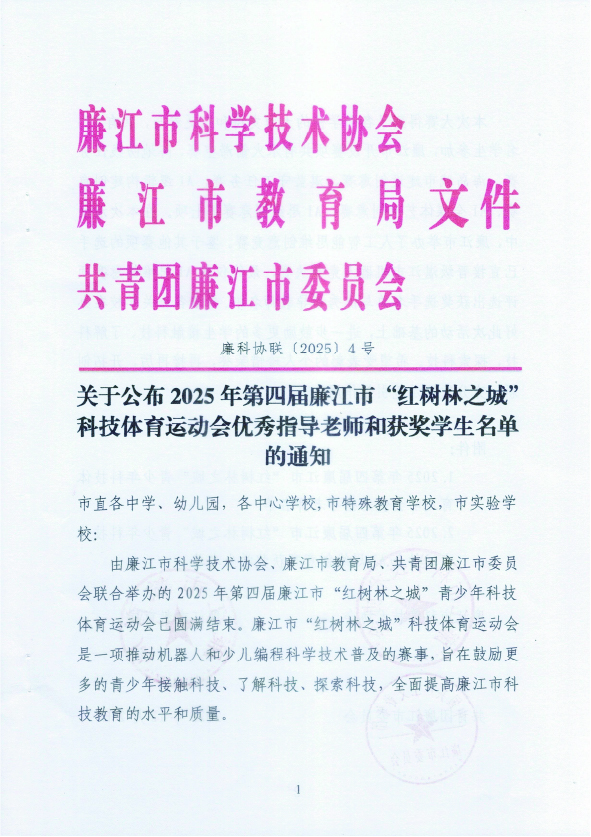 由廉江市科学技术协会、廉江市教育局、共青团廉江市委员会联合举办的 2025 年第四届廉江市“红树林之城”青少年科技体育运动会已圆满结束。廉江市“红树林之城”科技体育运动会是一项推动机器人和少儿编程科学技术普及的赛事,旨在鼓励更多的青少年接触科技、了解科技、探索科技,全面提高廉江市科技教育的水平和质量。