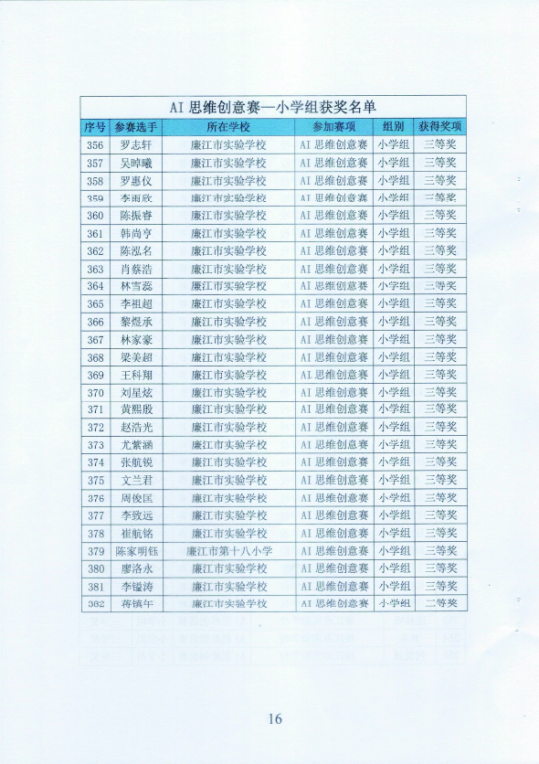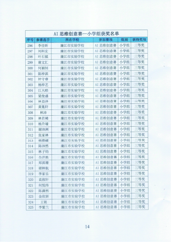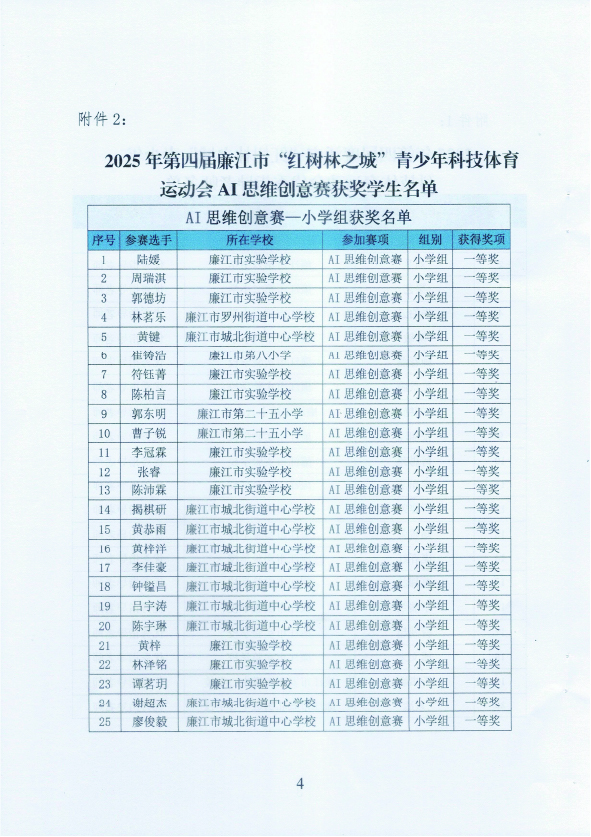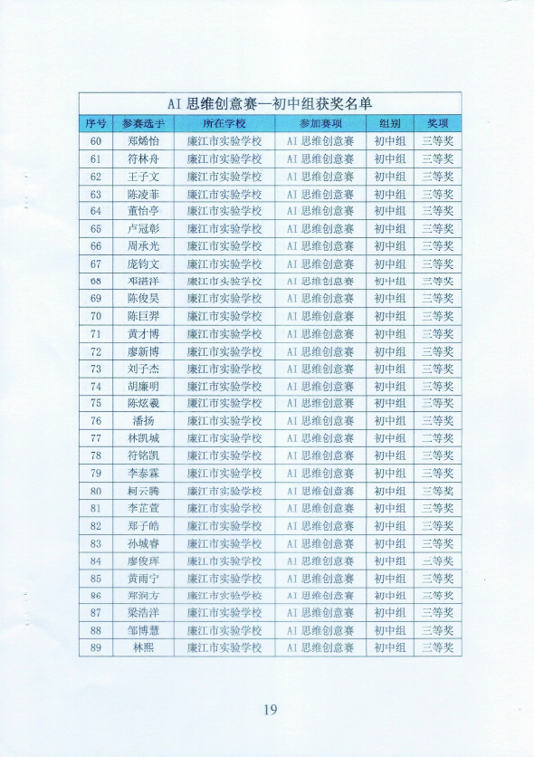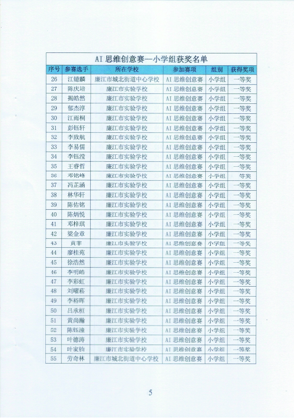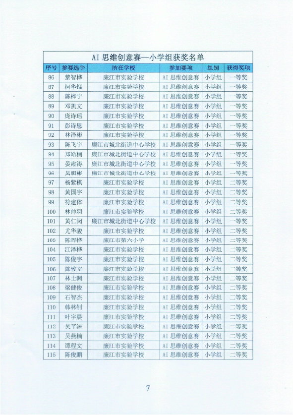 本次大赛得到了各个学校的大力支持和广泛参与,共有 873名学生参加,廉江市开设赛项共有水火箭滞空赛、阵地防线任务赛、海岛城市建设创意赛、湛蓝守卫任务赛、AI 逻辑构建创意赛、AI 全媒体艺术创意赛、AI 思维创意赛等七项。在本次活动中,廉江市举办了人工智能思维创意竞赛。鉴于其他赛项的选手已直接晋级湛江市机器人竞赛决赛,最终仅就 AI 思维创意赛项评选出获奖选手名单与优秀指导教师名单。
