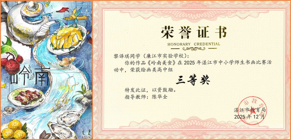 墨香润心育桃李,画笔传情绘中华。近日,以“粤彩染学堂 丹青绘中华”为主题的2025年湛江市中小学师生书画比赛圆满落幕。作为全市中小学艺术教育成果的重要展示平台,本次赛事旨在提升中小学师生审美素养与艺术创作能力。