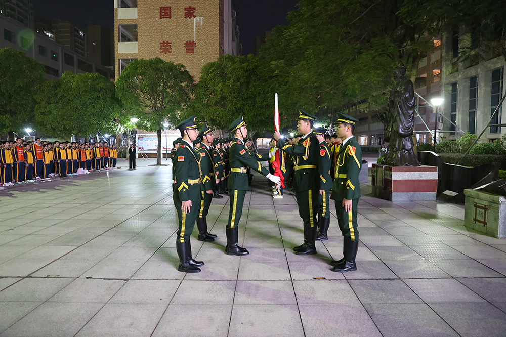 当高一级国旗护卫队代表钟饶郑重地从高二级国旗护卫队代表卜泳铭手中接过了庄严的五星红旗那一刻起,象征着接过了神圣的使命。紧接着新一届国旗护卫队队员迈着整齐的步伐护卫国旗来到旗杆前,伴随着嘹亮的国歌声,屏气凝神,肃然起敬,系旗、甩旗、升旗,一连串动作一气呵成,完成他们的第一次升旗任务。庄严中尽显气势,威武中不失优美。