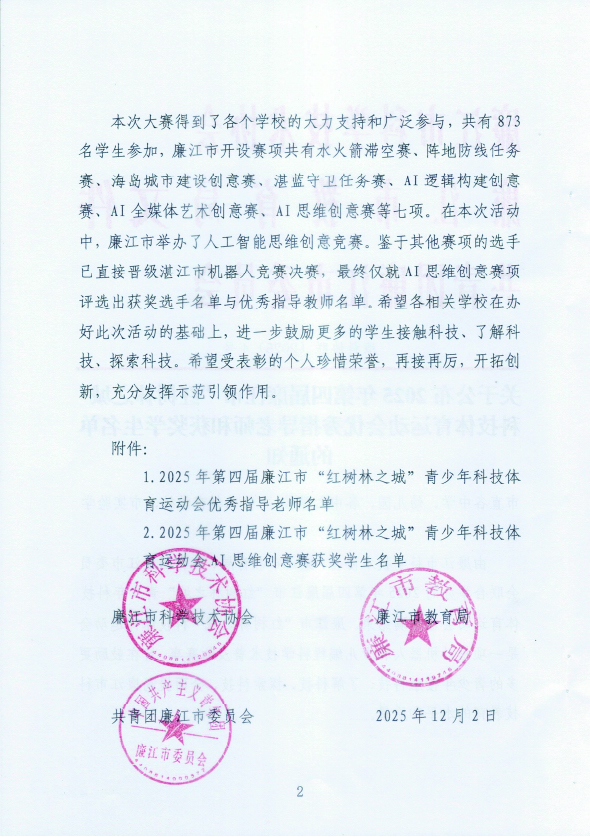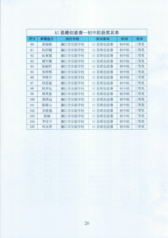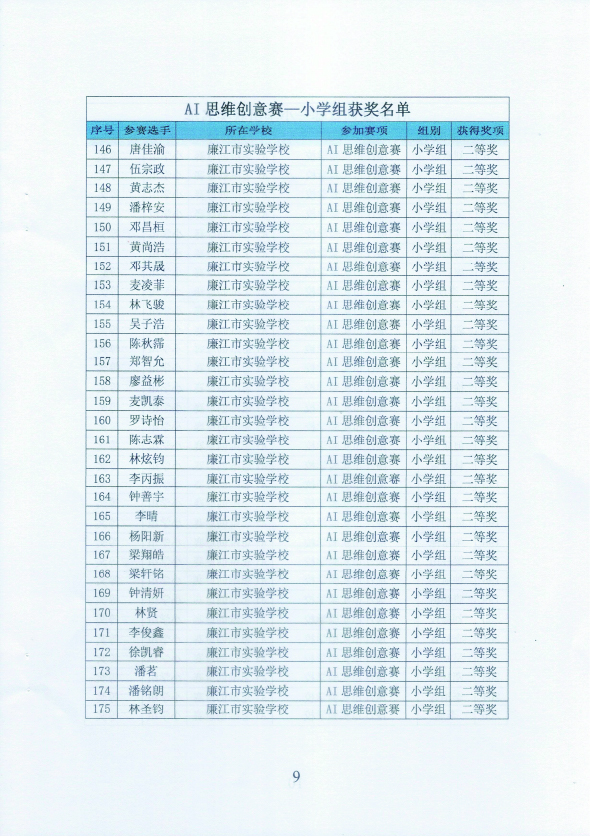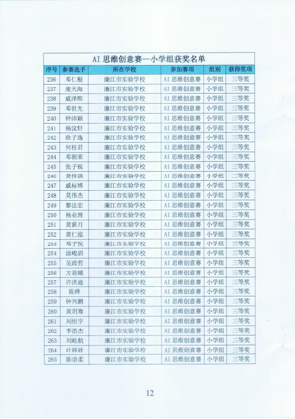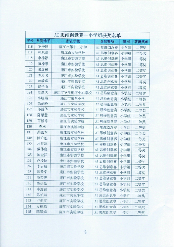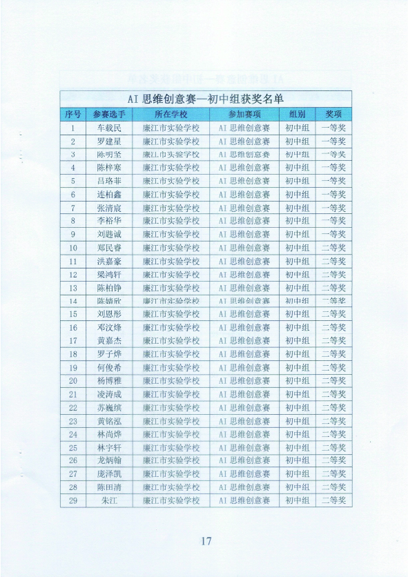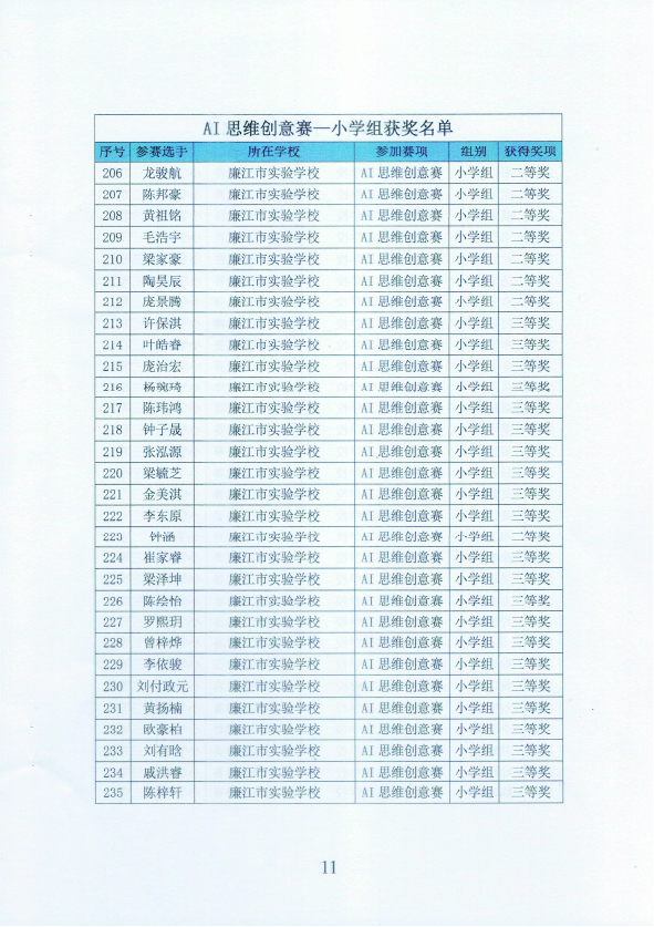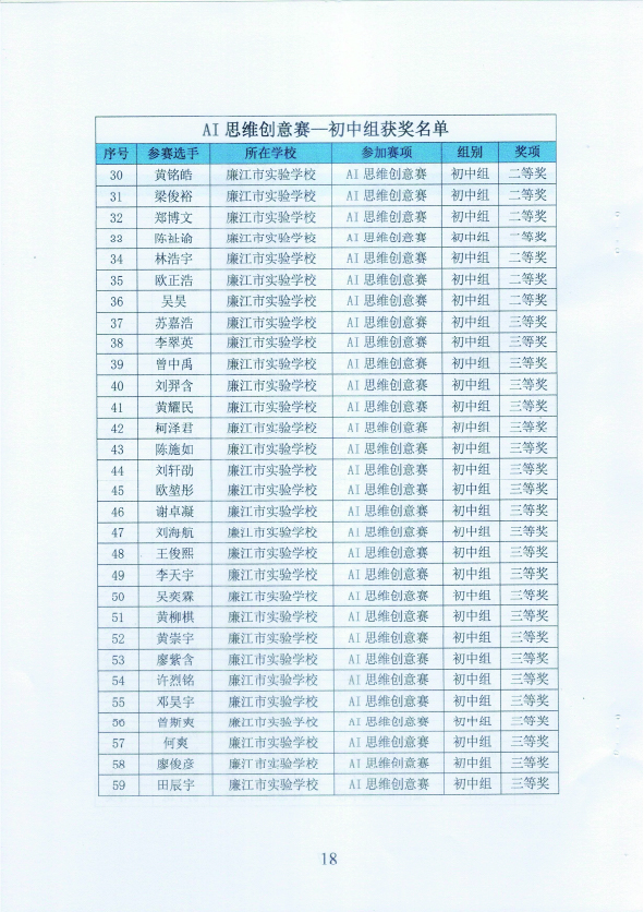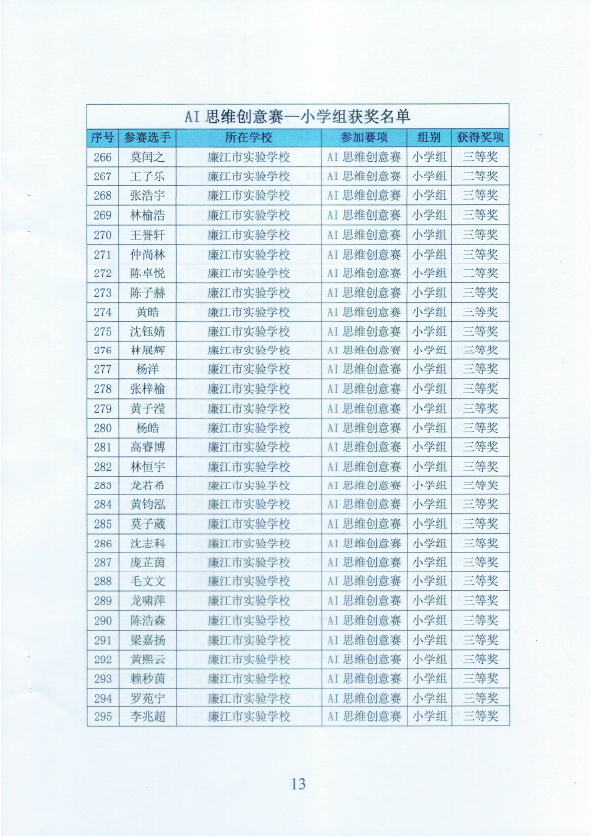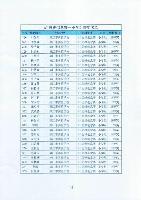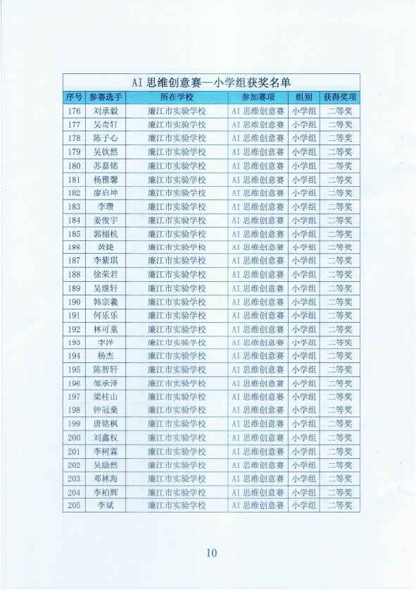 本次大赛得到了各个学校的大力支持和广泛参与,共有 873名学生参加,廉江市开设赛项共有水火箭滞空赛、阵地防线任务赛、海岛城市建设创意赛、湛蓝守卫任务赛、AI 逻辑构建创意赛、AI 全媒体艺术创意赛、AI 思维创意赛等七项。在本次活动中,廉江市举办了人工智能思维创意竞赛。鉴于其他赛项的选手已直接晋级湛江市机器人竞赛决赛,最终仅就 AI 思维创意赛项评选出获奖选手名单与优秀指导教师名单。