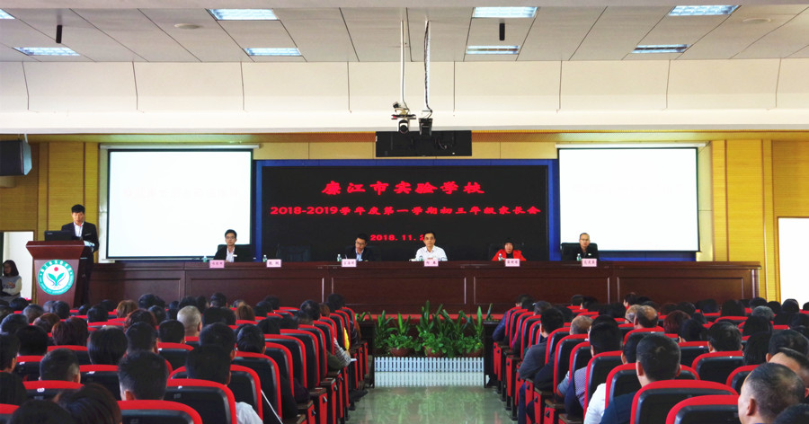 2018年11月23日,我校初中部初三年级召开了以“家校合作,备战中考”为主题的家长会,近1100位家长参加了本次家长会。 郑春校长讲话 初中部温树娟副校长发言 曹耀同学发言 早上8:30,初三年级全体家长集中厚德楼六楼会议室主会场集体开会。会议由初三年级张帆主任主持,廉江市实验学校郑春