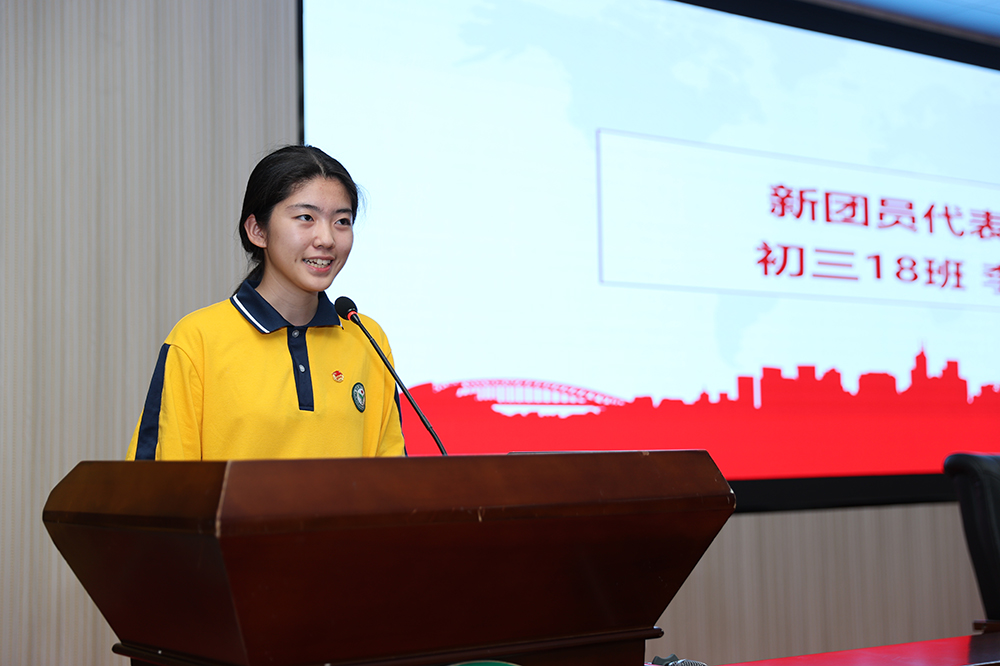 新团员代表初三(18)班李宛颖同学表示自己很荣幸能够成为一名共青团员,她郑重承诺今后会努力履行入团誓言,严格要求自己,在学习和生活中发挥模范带头作用。